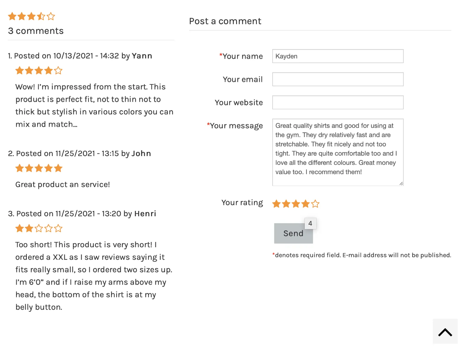 La valutazione di stelle è ora visualizzata con i commenti dei visitatori. Le stelle sono ora visualizzate come SVG sfondi per una presentazione perfetta sugli smartphone, e il loro colore può essere personalizzato. In una pagina del prodotto del catalogo, la nota viene visualizzata sotto il titolo del prodotto con un collegamento per accedere direttamente alle recensioni del prodotto. Infine, il modulo per l'aggiunta di commenti è ora visualizzato accanto ai commenti e non più riportato (tranne su smartphone).