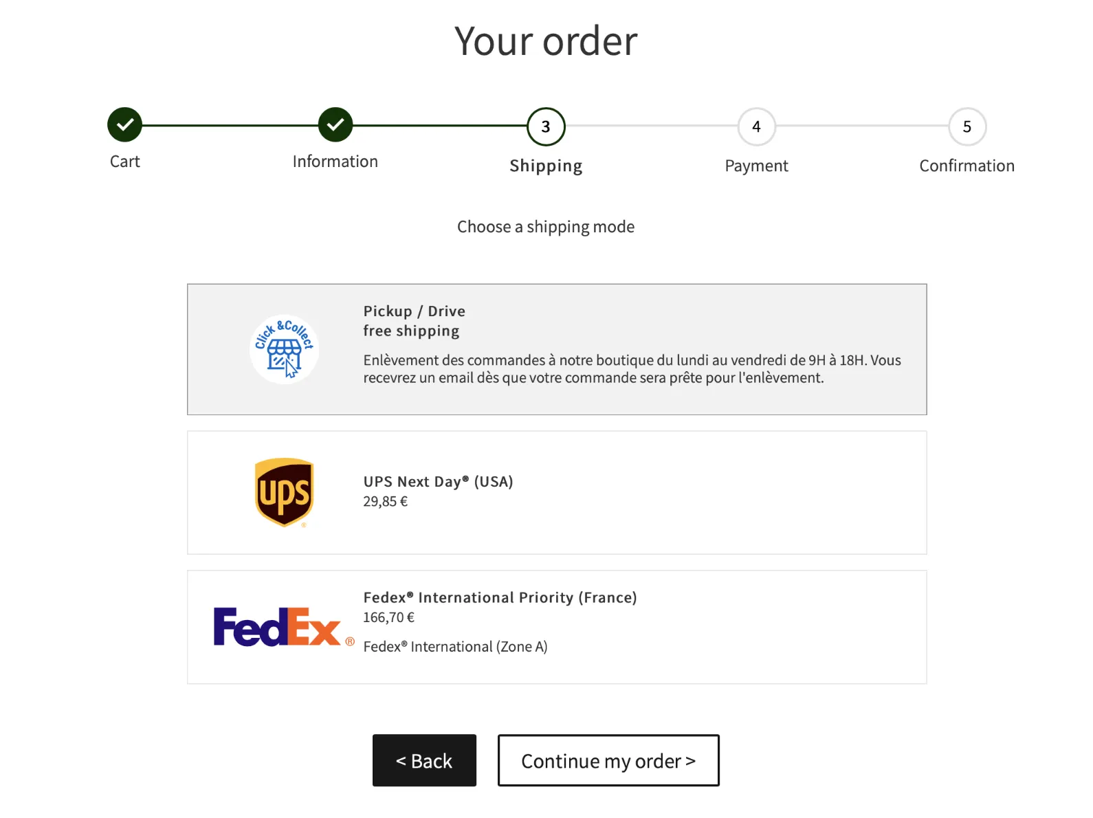 Nella pagina Checkout, le icone delle modalità di spedizione e di pagamento sono ora in formato SVG per un display perfetto su tutti i dispositivi e la selezione della modalità di spedizione e pagamento è ora eseguita facendo clic su pulsanti di grandi dimensioni per un'esperienza utente migliore sugli smartphone . Inoltre, le modalità di spedizione sono ora ordinate per prezzi (dal più economico al più costoso) per limitare l'abbandono del carrello.