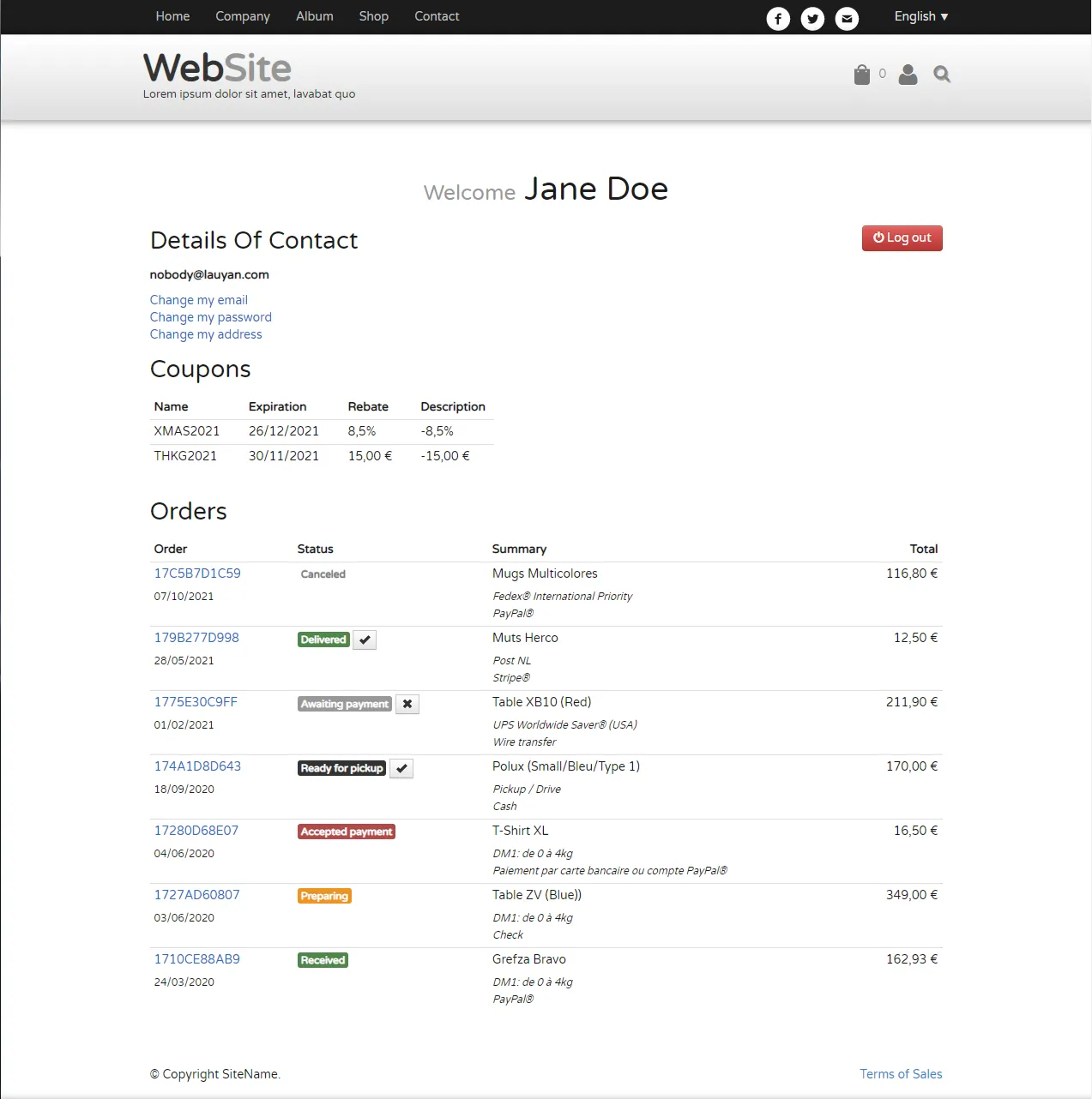 Quando acquisti dal tuo sito di e-commerce, i tuoi clienti possono ora creare o connettersi al proprio account cliente. La creazione di un account non è obbligatoria, possono continuare a fare acquisti come ospite. I clienti registrati avranno una storia e un follow-up di tutti i loro ordini e sarà in grado di cancellarli o di informarti sulla loro buona consegna. Sarai in grado di creare singoli coupon utente per utenti registrati dal back-office del tuo sito e segui la quantità totale acquistata dai tuoi clienti.